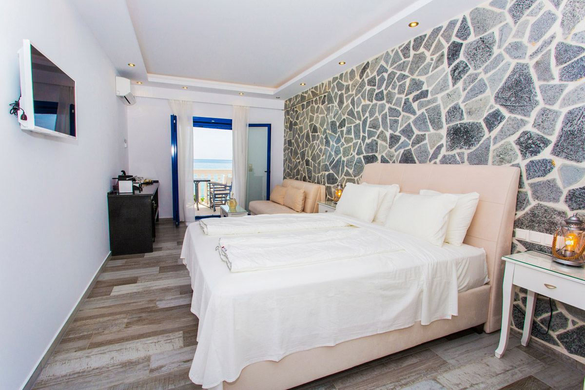 κρεβάτι ή 2 μονά κρεβάτια, καναπέ κρεβάτι, κλιματισμό, τηλεόραση, ιδιωτικό μπάνιο με ντους και σας προσφέρουμε τη δική σας ξαπλώστρα στην παραλία!